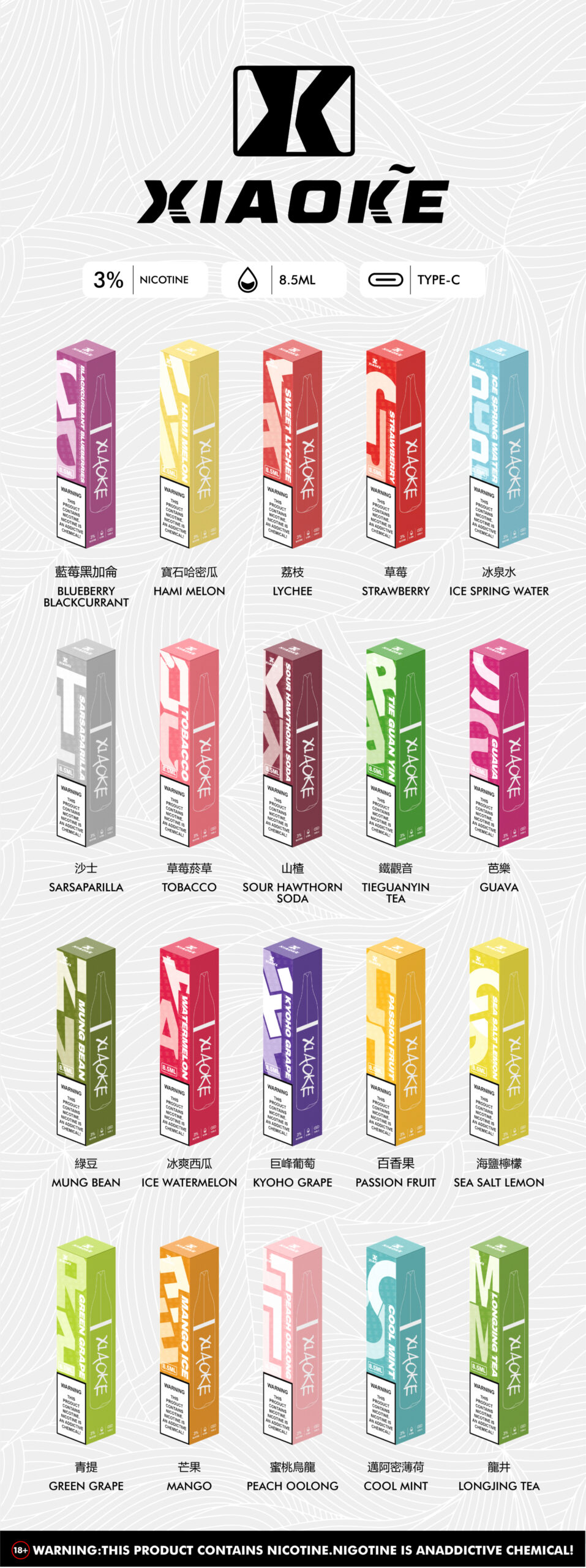 藍莓黑加侖, 寶石哈密瓜, 荔枝, 草莓, 冰泉水, 沙士, 草莓煙草, 山楂, 鐵觀音, 芭樂, 綠豆, 冰爽西瓜, 巨峰葡萄, 百香果, 海鹽檸檬, 青提, 芒果, 蜜桃烏龍, 邁阿密薄荷, 龍井